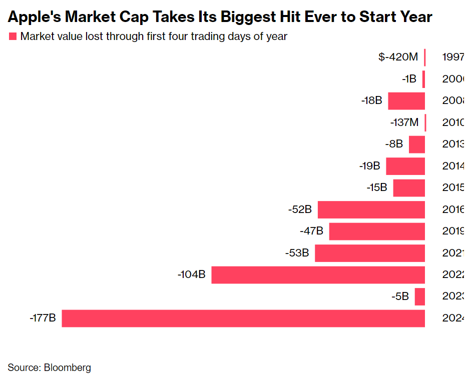 The Cupertino, California-based company has been the most valuable publicly-listed company since July 2022, but has seen about $177 billion in market value erased so far this year, according to data compiled by Bloomberg. While the stock has suffered bigger percentage declines in the first week of January, the losses are the biggest market value destruction at the start of any year on record.