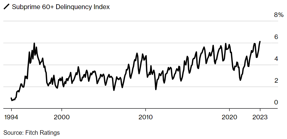 “The subprime borrower is getting squeezed,” said Margaret Rowe, senior director with the asset-backed securities group at Fitch. “They can often be a first line of where we start to see the negative effects of macroeconomic headwinds.”