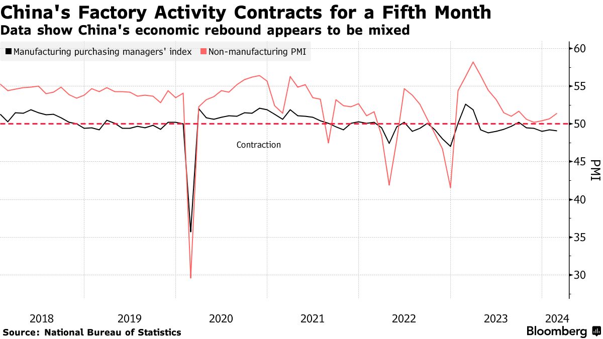 The official manufacturing purchasing managers index for last month edged lower to 49.1, the National Bureau of Statistics said. A gauge of non-manufacturing activity rose, adding to signs of an uneven recovery in the world’s No. 2 economy.