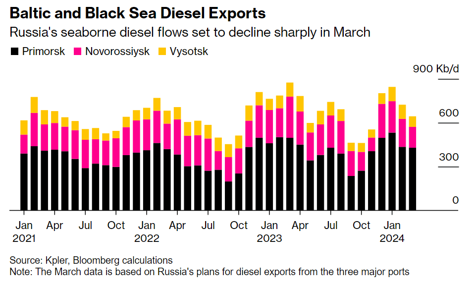 Russia plans to reduce daily diesel exports from its key western ports by 11% in March, after its refineries lowered crude-processing amid Ukrainian drone attacks. Russia no longer sends diesel to Europe due to Western energy sanctions. However, the drop in flows from one of the top global diesel exporters could create further pressure for the European market, which has been shaken by the disruption of shipments in the Red Sea and maintenance at regional refineries.