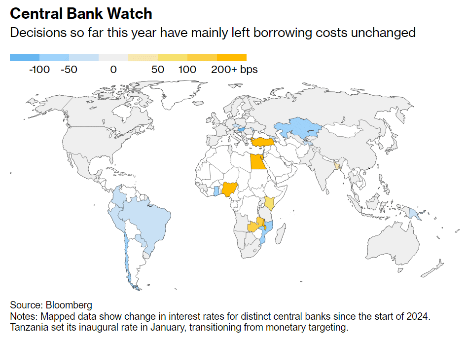 Israel’s central bank opted against another rate cut out of concern that inflation might reaccelerate as the war against Hamas continues. Nigeria’s central bank, in its first policy meeting since July, announced a super-sized hike to tackle runaway inflation and stem the collapse in its currency. Hungary cut at a faster pace after inflation slowed more than expected, while New Zealand and the Dominican Republic left rates unchanged.
