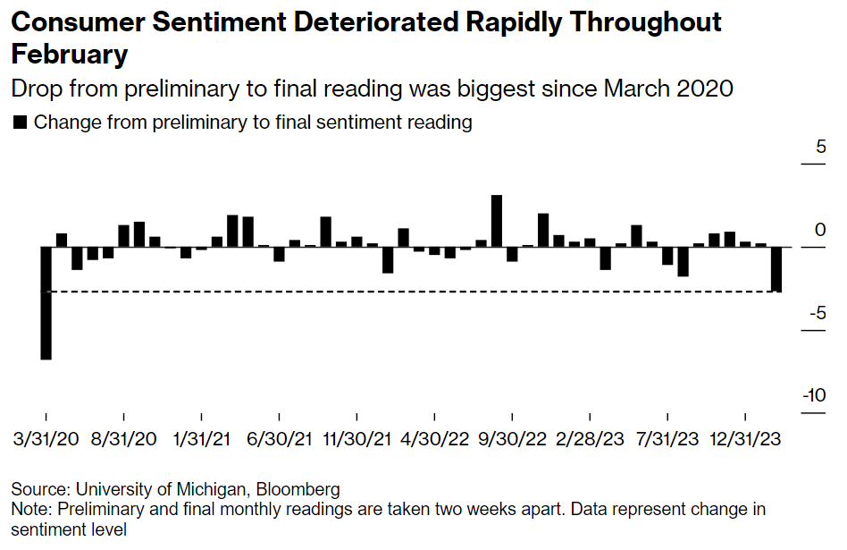 Consumer sentiment faltered in late February as current views of the economy and the outlook deteriorated, marking a reversal from earlier in the month that showed a pickup in optimism. The intramonth drop was the biggest since March 2020.