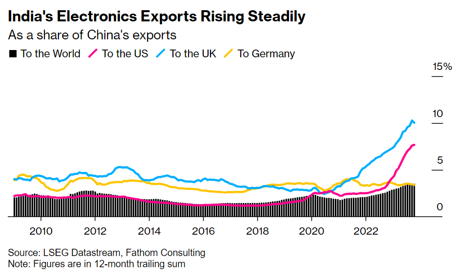 India is chipping away at China’s dominance in electronics exports in some key markets as manufacturers diversify supply chains away from the world’s factory to other parts of Asia, a new study shows. The impact is most pronounced in the UK and US, where geopolitical tensions with China have increased in recent years.