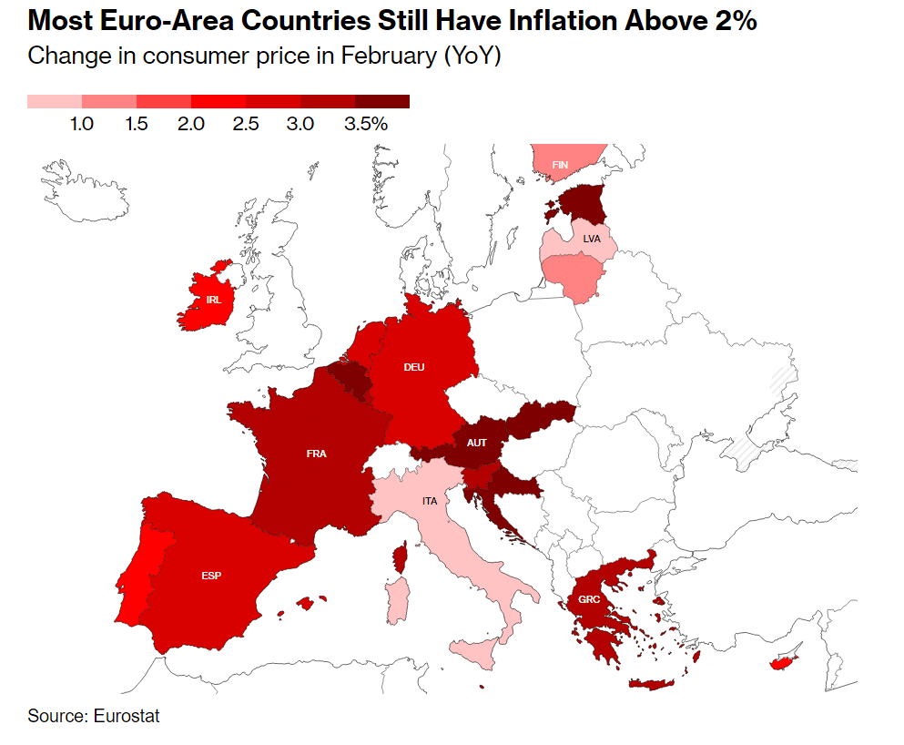 Inflation remains elevated in the US and euro-zone, supporting assertions from central bankers in both regions that it’s too soon to start cutting interest rates.
