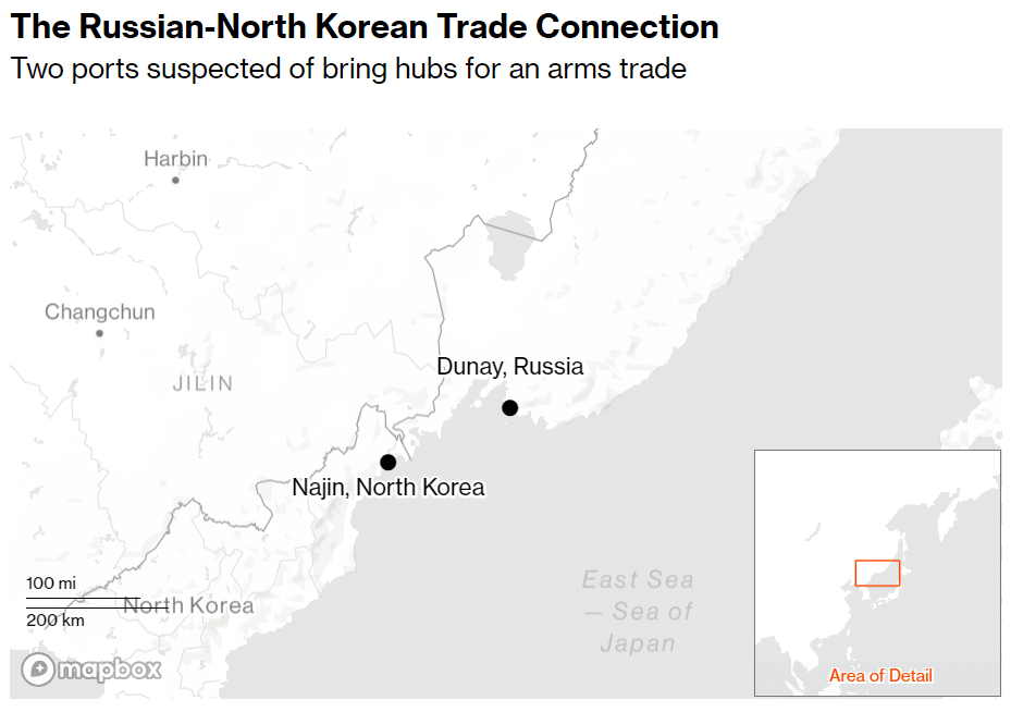North Korea has shipped containers that could hold millions of artillery shells to Russia, a top South Korean official said, allowing President Vladimir Putin to maintain his assault on Ukraine as Kyiv’s stocks of ammunition dwindle. Russia in return is providing North Korea with food, raw materials and parts used in weapons manufacturing, the official said, which is helping Kim Jong Un stabilize prices for necessities.