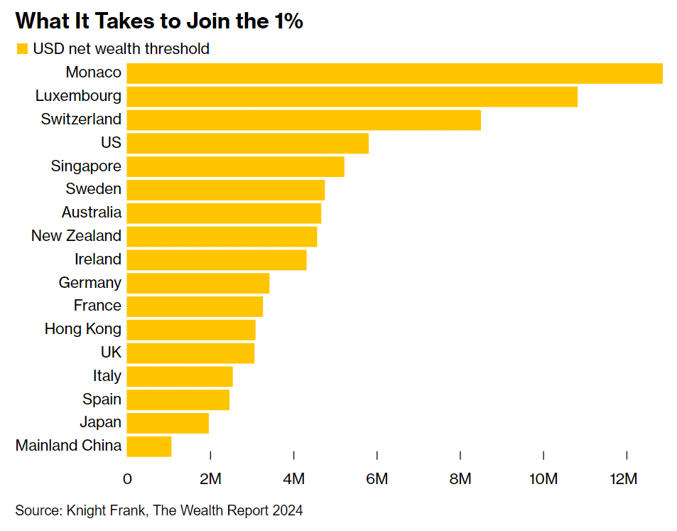Breaking into the top 1% of wealth in the US is getting harder. It now takes at least $5.8 million to join the richest echelon in the world’s largest economy, almost 15% more than about 12 months ago, according to research from Knight Frank. Monaco retains the top spot for the highest threshold worldwide at $12.8 million, while in Luxembourg and Switzerland one needs more than $8 million to make the cut.