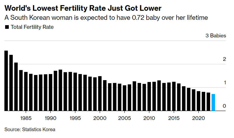 South Korea set a fresh record for the world’s lowest fertility rate as the impact of the nation’s aging demographics looms large for its medical system, social welfare provision and economic growth. The number of births also slid 7.7% to 230,000, setting a new low for comparable data in a nation of about 50 million people.