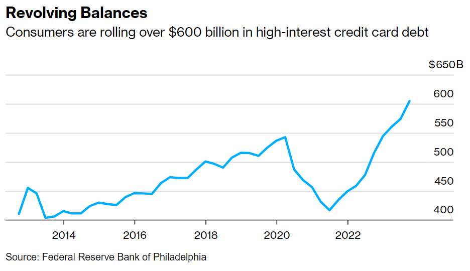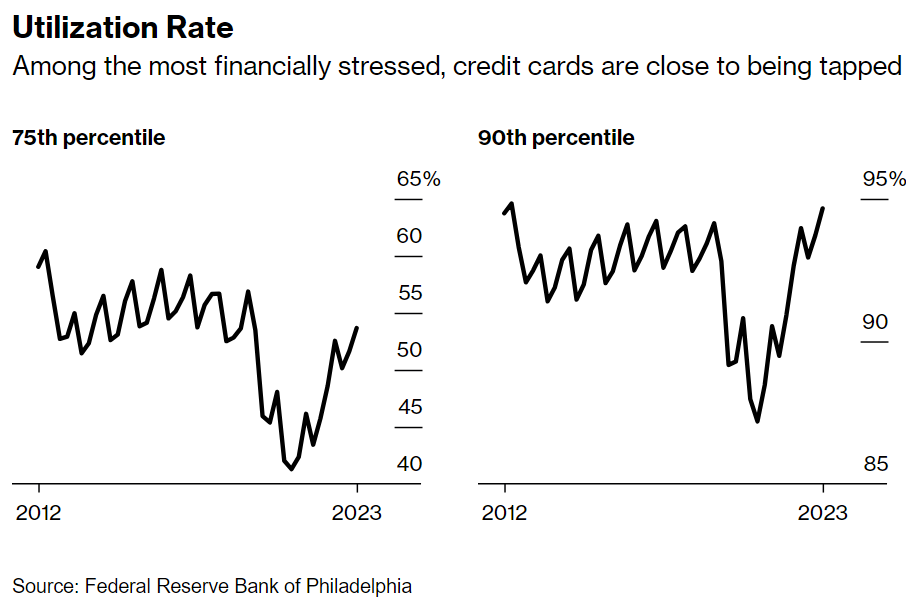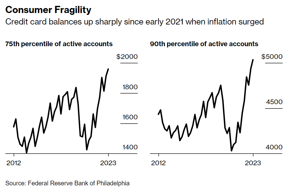 The numbers point to pressure on US household finances, after a post-pandemic surge in the cost of living that wasn’t always matched by higher incomes. About 10% of credit-card borrowers now have an account balance that exceeds $5,000, according to the Philadelphia Fed.