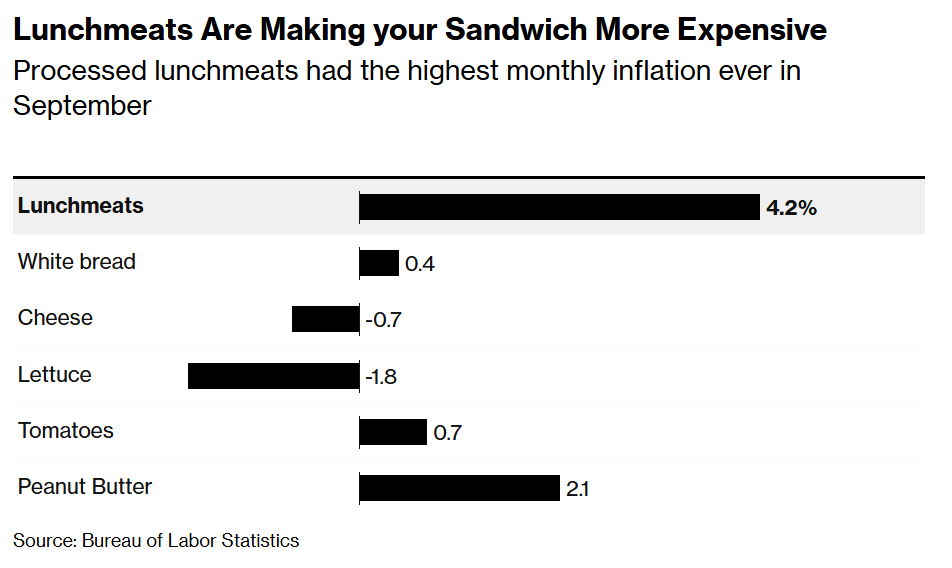 Consumer prices for lunchmeats rose 4.2% in September, the largest monthly increase on record, far outpacing the 0.3% rise in broader grocery costs, according to the Bureau of Labor Statistics. Year on year, lunchmeat prices increased at almost the same pace.