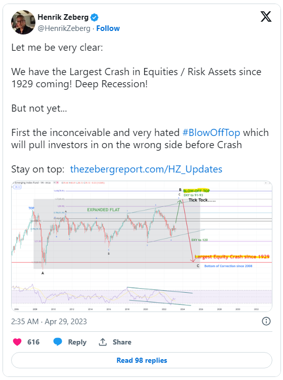 Zeberg tweeted that he sees the equities markets collapsing as the dollar index goes on a parabolic surge.