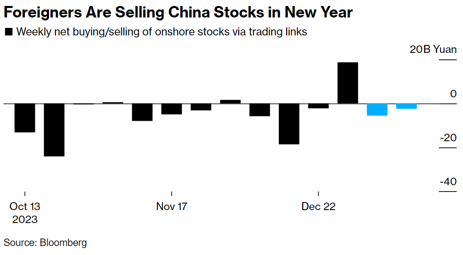 Chinese equities saw their worst start to a year since 2019 and are trading near their lowest level in nearly five years. The selling came after foreigners recorded their smallest-ever annual purchases of onshore stocks in 2023, putting January on track for a sixth straight month of outflows.
