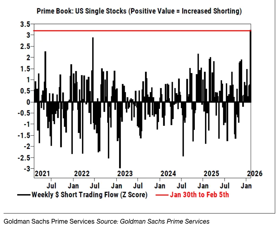 Notional short selling across single stocks last week was the biggest on record in Goldman Sachs Group Inc. data going back to 2016, the bank’s prime brokerage team said in a client note. Short sales outpaced long buys by a magnitude of two-to-one, the team including Vincent Lin said, citing flows from the Jan. 30 to Feb. 5 period.