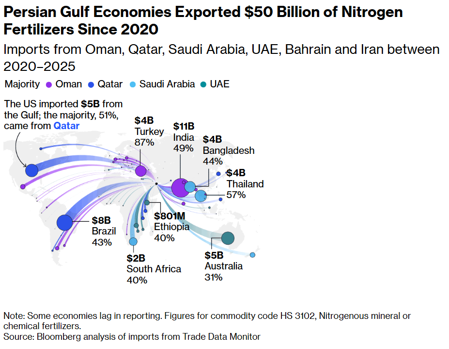 The Gulf region has become a significant producer of nitrogen fertilizers in recent decades, and the Strait of Hormuz was handling about a third of the global trade before the war broke out. The conflict has severely disrupted exports from the region, sending prices soaring and farmers scrambling to secure enough of the products while they can.