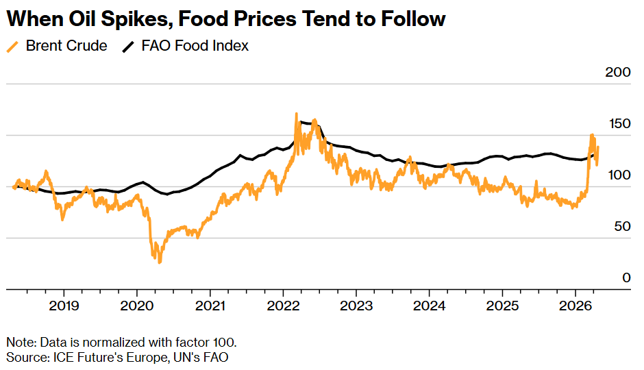 Before the Iran war broke out, food inflation around the world was generally expected to ease this year. Food commodity costs are still well below their peak of March 2022 following Russia’s full-scale invasion of Ukraine, but the impact of the war is starting to feed through into official price gauges. Global food costs rose to a six-month high in March. Inflationary pressure was expected to grow in April and intensify in May, the FAO said.
