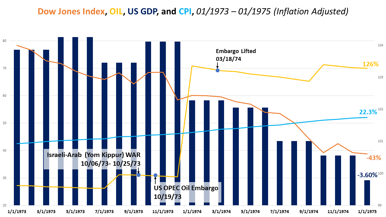 Investors were caught off guard by the 1973 shock. The Dow Jones Composite Index was higher on 11/1/73 than it was on 10/6/73, which is when the Israel Arab Yom Kippur war began. The war, which ended on 10/25/73, included OPEC placing an embargo for oil sold to the US on 10/19/73. The embargo was the catalyst that caused the price shock. By the time the embargo was lifted on 03/18/74, the Dow had declined by 13% from its Q4 of 1973 November high.