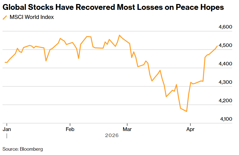 Hartnett said the survey findings are “contrarian positive for risk assets,” provided a ceasefire pushes the price of oil below $84 a barrel. In Tuesday’s trading, stocks rose and benchmark Brent crude fell below $99 as Iran and the US considered another round of peace talks.