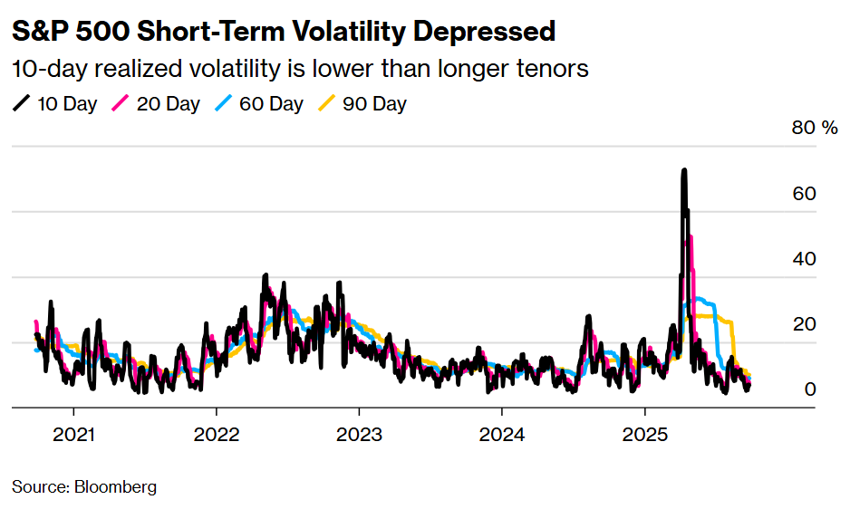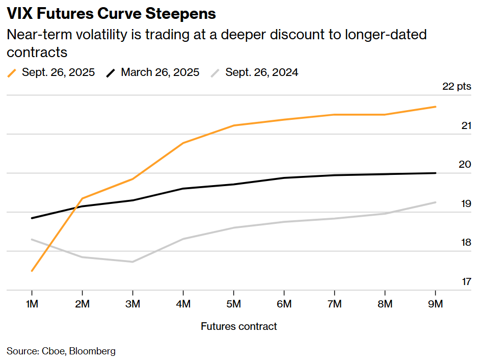 That’s been especially pronounced for immediate volatility, with the S&P 500 trading in tight ranges. This has kept short-term options implied volatility cheaper, which in turn depresses the spot VIX index and front-month futures.