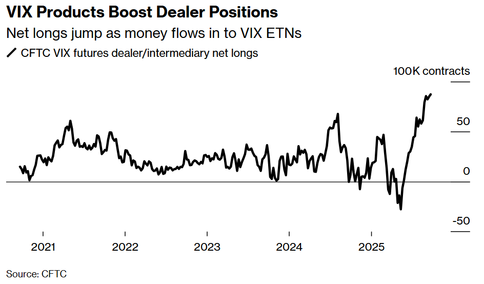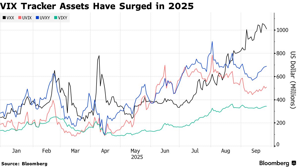 The largest product that follows the performance of Cboe Volatility Index futures, the Barclays iPath S&P 500 VIX Short-Term Futures ETN, has increased assets by more than 300% this year to over $1 billion. The attraction is that if the record stock rally withers, market volatility will spike, delivering spectacular returns.