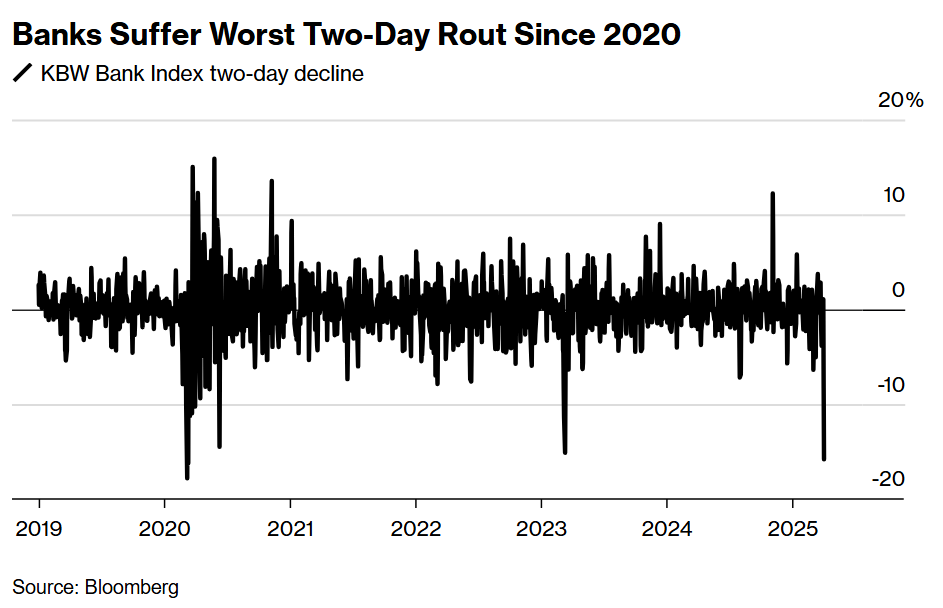 The rout started on Thursday when the introduction of the steepest American levies in a century saw the key banking sector benchmark drop 9.9%. The gauge has dropped more than 20% from its February highs — pushing the index into a bear market.