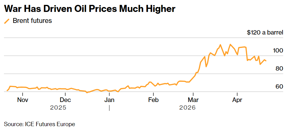 Benchmark oil futures rallied about 30% since the war began. They spiked to almost $120 a barrel in early March but have since subsided, trading near $95 on Tuesday amid tentative hopes the US and Iran can reach some kind of peace deal.