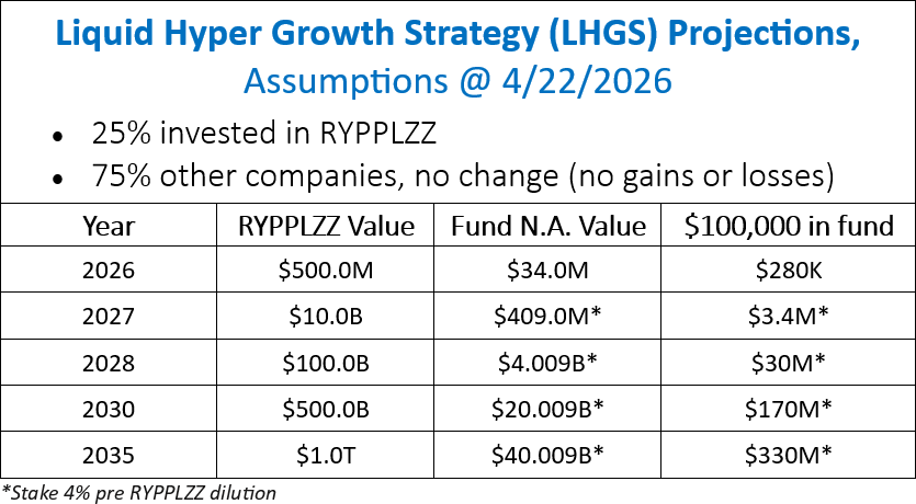 Its possible, via a fund to participate in RYPPLZZ, that is deploying my Liquid Hyper Growth Strategy (LHGS).  The fund has a 25% weighting in RYPPLZZ and the stake as of 3/31/26 represented a four percent stake in the company.  Upon RYPPLLZZ, receiving monies from investors at its existing $500 million valuation, the net asset value for $100,000 in the fund will increase to $280,000.  The amount assumes no change in the value of the fund’s other holdings.