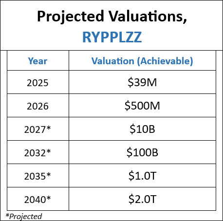 The table below contains my achievable valuations and timelines for RYPPLZZ.  The valuations are driven by the company’s patented technology and its $47 Trillion of total addressable Markets (TAM).  RYPPLZZ’s proprietary and patented technology that enables it to identify unidentified flying objects which are the size of a mosquito is the wild card.   Should the technology be deployed in the Middles East the valuation could quickly zoom to $100 billion.   By the way, the company has been introduced to my high level contacts in the UAE and in Saudi Arabia.