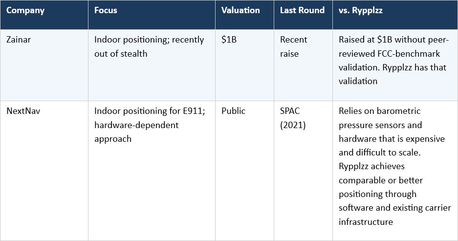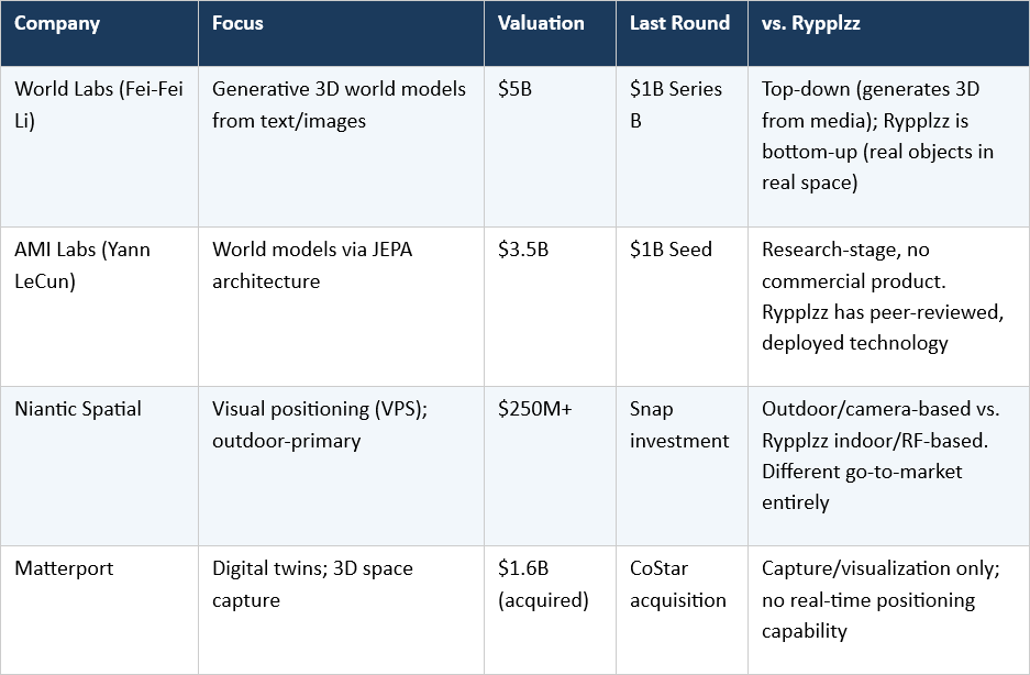 Spatial intelligence and world models have attracted significant capital in 2025 and 2026. Rypplzz is differentiated by having validated, deployed technology with carrier-grade performance and direct commercial relationships with US carriers, at a fraction of the valuation of competitors with less tangible proof points.