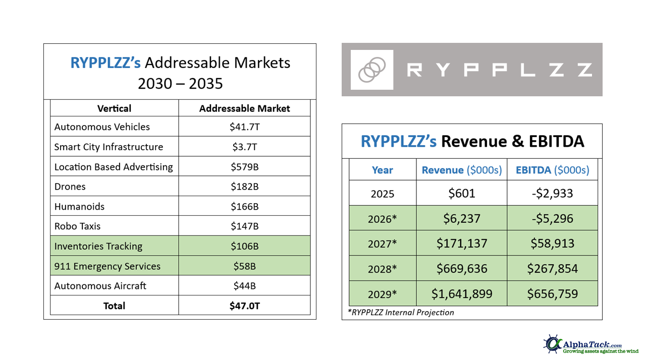 The table on the right below contains RYPLLZ, current valuation $500 million, internal revenue and EBITA projections through 2029.  The projections at 12/31/2025 were exclusively based up on RYPPLZZ penetration of the Inventories Tracking and 911 Emergency Services vertical markets through 2029.   Note that RYPPLZZ projections at end of 2025 do not include 911 services for non U.S. mobile phone carriers.  Projections also do not include newly and fast emerging drones vertical.  See my 03/17/26 RYPPLZZ, Big War Beneficiary” report.