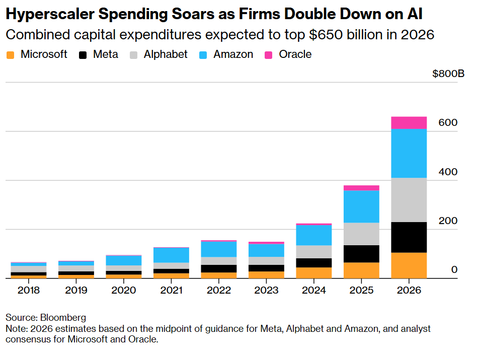 This time round, the shortages stem from the memory industry’s pivot toward AI. Meta Platforms Inc., Microsoft Corp., Amazon and Alphabet are throwing astronomical sums at data centers that can train and host artificial intelligence algorithms, hiking spending from $217 billion in 2024 to about $360 billion last year — to an estimated $650 billion in 2026.
