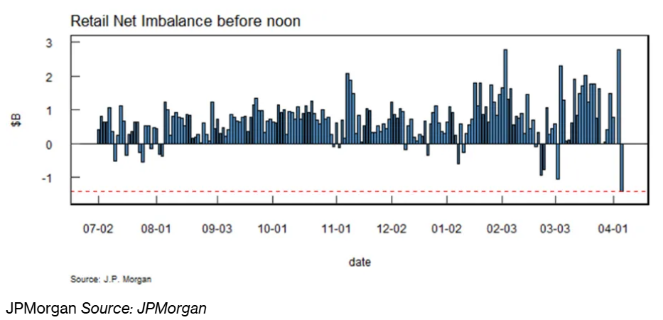 JPMorgan reported retail orders amount to net selling of $1.5 billion as of noon Friday, the most in the first 2.5 hours of trading in its history. That came a day after the firm’s figures showed individuals were net buyers of $4.7 billion of shares, the biggest day over the past decade.