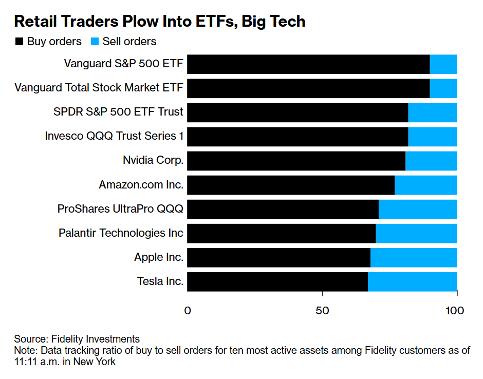 Fidelity investors snapped up shares of Nvidia Corp. and Amazon.com Inc. amid a two-day slide that’s wiped out more than $500 billion between the two companies, according to data tracking the users of the brokerage. They also added to market-tracking ETFs like the Vanguard S&P 500 ETF and the SPDR S&P 500 ETF Trust in another contrarian bet.