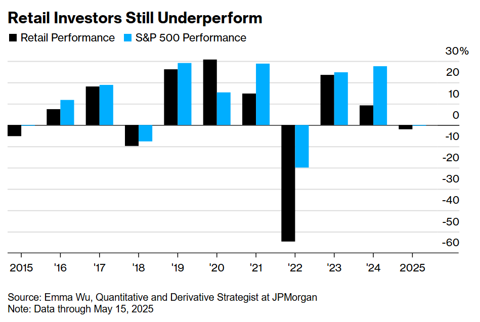 Individual investors snapped up equities at a record pace throughout the stock-market churn, as the S&P 500 dove to the cusp of a bear market and then rallied to basically flat for the year in a month. The dip-buying earned retail traders a roughly 15% return since April 8, the day before Trump’s tariff pause, as they plowed a net $50 billion into US stocks, based on data from JPMorgan Chase & Co. quantitative and derivative strategist Emma Wu.