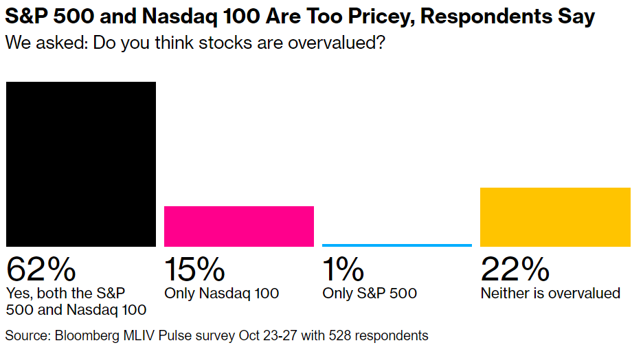 The Nasdaq 100 will decline by as much as 10% this quarter, according to 45% of respondents. A fifth say it will slump more than that. Earlier in the year, enthusiasm surrounding artificial intelligence spurred investors to overlook rising interest rates, propelling the Nasdaq 100 about 35% higher in the first three quarters of the year. It’s now on track for its third straight monthly decline, something it hasn’t done in more than a year. And by one calculation, the technology complex is still overvalued by 10% as of the close on Friday.