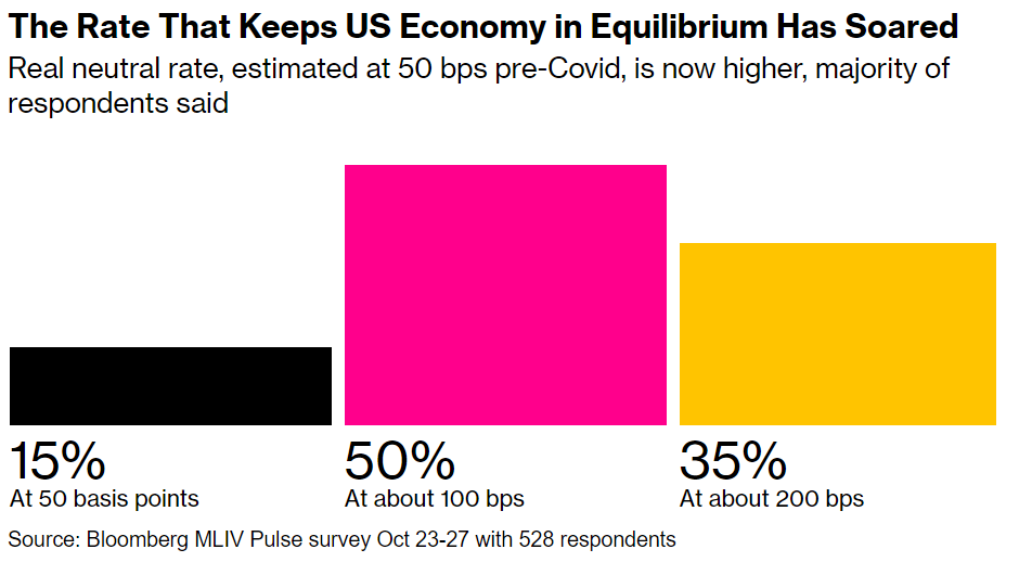 The interest rate that neither spurs nor slows the US economy has at least doubled in the aftermath of the pandemic, handing investors a reason to be nervous about buying bonds or stocks, according to the latest Bloomberg Markets Live Pulse survey.