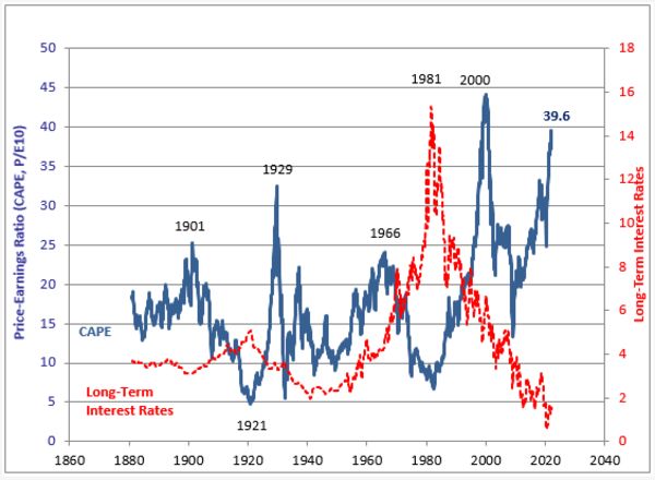 And if we turn to the most followed and most controversial long-term valuation metric, the cyclically adjusted price/earnings multiple produced by Professor Robert Shiller of Yale University, we find that his latest update (available here), shows the CAPE at its second-highest level in history. Stocks have only been more expensive than this for a few months at the very top of the internet mania in 2000: