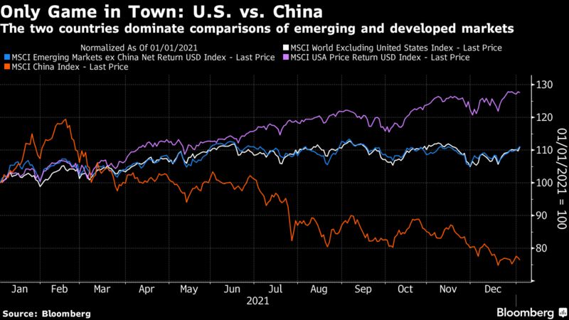 Lapthorne also suggests that the developed-versus-emerging framework has outlived its usefulness, owing to the dominance of the U.S. within the developed world, and China in emerging markets. As in geopolitics, the choice or conflict that matters is between the U.S. and China. In 2021, U.S. stocks did excellently, Chinese stocks terribly. The developed world outside the U.S. and the emerging one outside China had almost identical returns, of about 10%: