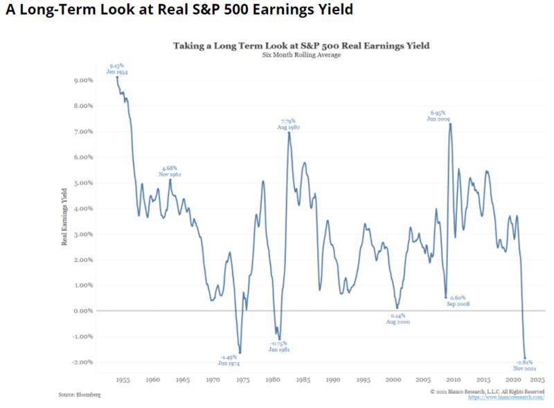 Returning to the U.S., how expensive are stocks really? If we take the earnings yield (the inverse of the price/earnings ratio) and subtract the current rate of inflation, we find that it has just dropped below -3% for the first time: