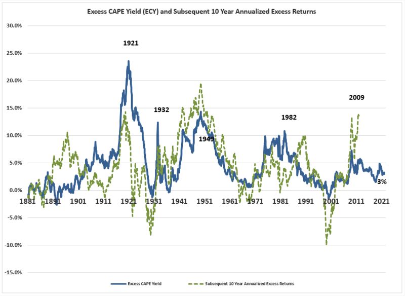 Shiller always publishes his CAPE estimates jointly with his measure of 10-year interest rates. Those are far lower now than 22 years ago, and that justifies paying a higher multiple for stocks. But just how much? Shiller has his own crude measure, which is the Excess CAPE Yield — the number that results from subtracting the 10-year Treasury yield from the CAPE earnings yield. This has been a decent predictor of subsequent relative performance, as this chart shows:
