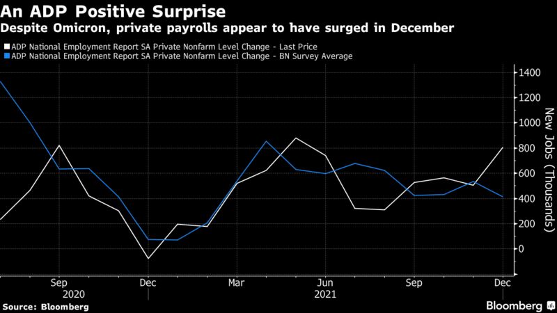 Again, fluke results do happen. The ADP survey is often out of kilter with the official data, and December’s circumstances, with a holiday season colliding with the advent of a new virus variant, make it particularly hard to gauge what is going on. But on the face of it, if jobs are climbing like this, any reason for more support from the Fed goes out the window.