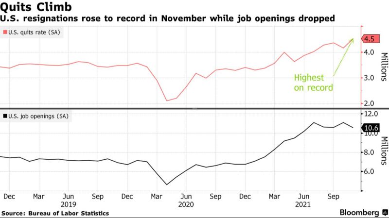 The JOLTS data on job openings for November also arrived this week, showing a slight reduction in the number of vacancies (implying very slightly reduced upward pressure on wages), and yet another rise in the number of people voluntarily quitting, which suggests a continued tight labor market:
