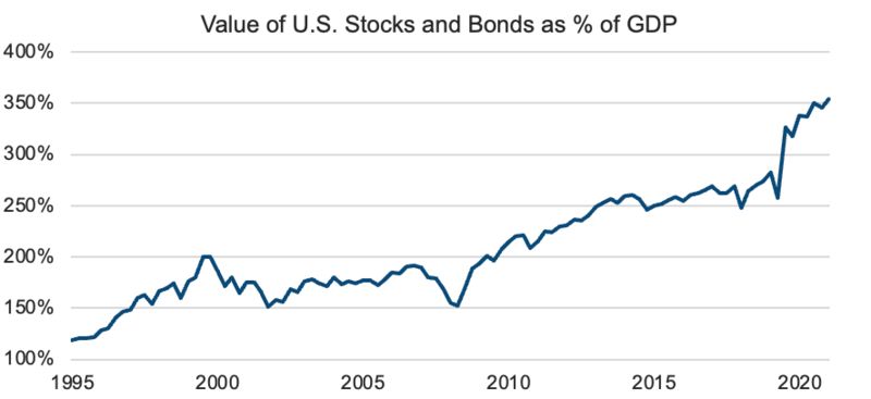 The following charts are from Milliman Inc. and look at the combined value of stocks and bonds in the U.S. compared to gross domestic product. The financialization of the economy moves on apace, and the ratio has more than doubled since the trough of the Great Financial Crisis. It surged more than ever before during the pandemic year, and kept rising in 2021: