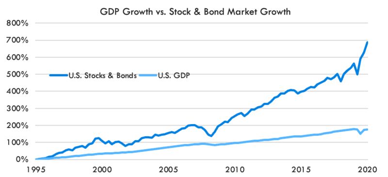 Viewed separately, we can see that the growth of investment assets detached completely from economic growth in the two years since the pandemic hit: