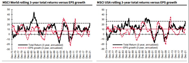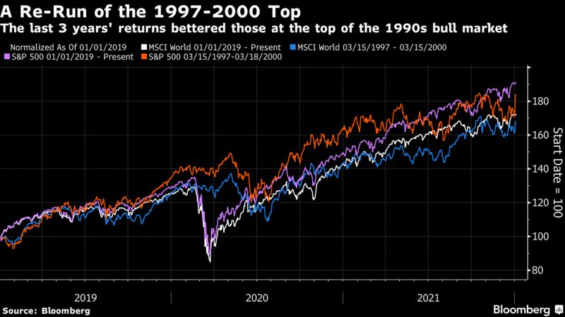 What of last year’s return? We know that returns were influenced by the Covid selloff in the spring of 2020. But Andrew Lapthorne, chief quantitative strategist at Societe Generale SA, points out that if we look at the last three years’ performance (excluding the Covid selloff altogether), it has been slightly better than the three-year return up to March 2000, the conclusion of arguably the greatest bull market on record. This is true whether we use the S&P 500 or the broader MSCI World:
