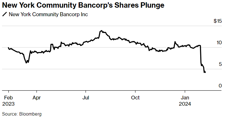 New York Community Bancorp, which had acquired part of Signature Bank in 2023, was the first to rattle markets when it announced a surprise loss tied to its credit book last week. Even if its commercial real estate portfolio is relatively small, its rating has now been downgraded to junk by Moody’s and the bank is looking to shed risk on a $5 billion mortgage portfolio.