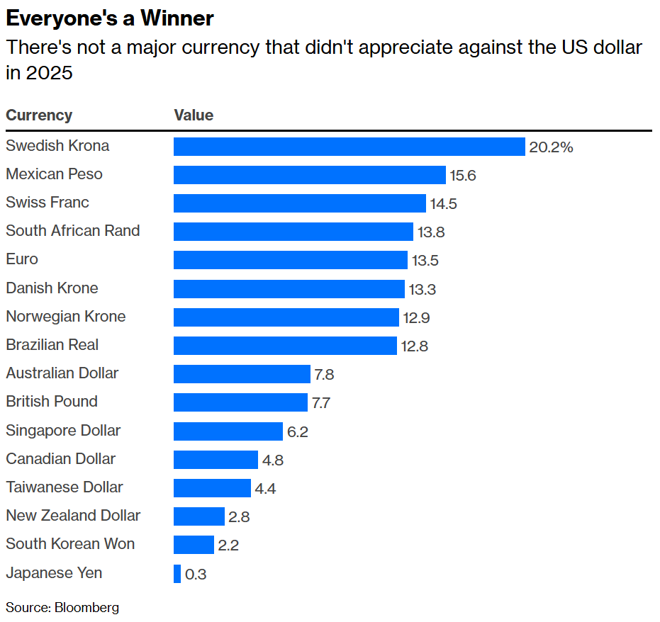 A nation’s currency is not much different than a company’s share price in that it’s probably the best indicator of sentiment. If so, the US is in trouble. The Bloomberg Dollar Spot Index, which measures the currency against its major market peers, fell about 8%, the worst showing since 2017 — the first year of Trump’s first term. The greenback depreciated against all the world’s 16 most-traded currencies as tracked by Bloomberg, a clear sign that investors are pushing back against Trump administration policies.