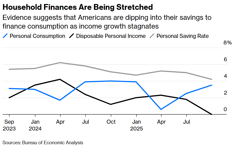 But what about the third-quarter gross domestic product report, which showed the economy expanded at a 4.3% annual rate, exceeding the median estimate of economists? Consider the troubling internals. The gain was powered by a 3.5% surge in personal consumption, while real disposable incomes were flat. Such a divergence suggests households are digging into their savings to make ends meet. It can’t last. In fact, the personal saving rate has dropped to 4%, the lowest since 2022, when inflation was raging.