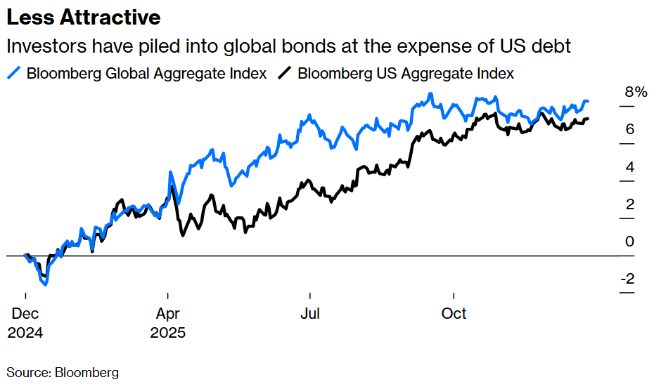 In the bond market, returns from US fixed-income assets trailed the world overall. Despite the Federal Reserve cutting benchmark interest rates three times since mid-September, investors took the unusual step of pushing long-term yields higher amid jitters over a possible reacceleration in inflation . As a result, the Bloomberg US Aggregate Index rose 7.30% in 2025, lagging behind the Bloomberg Global Aggregate Index’s gain of 8.17%.