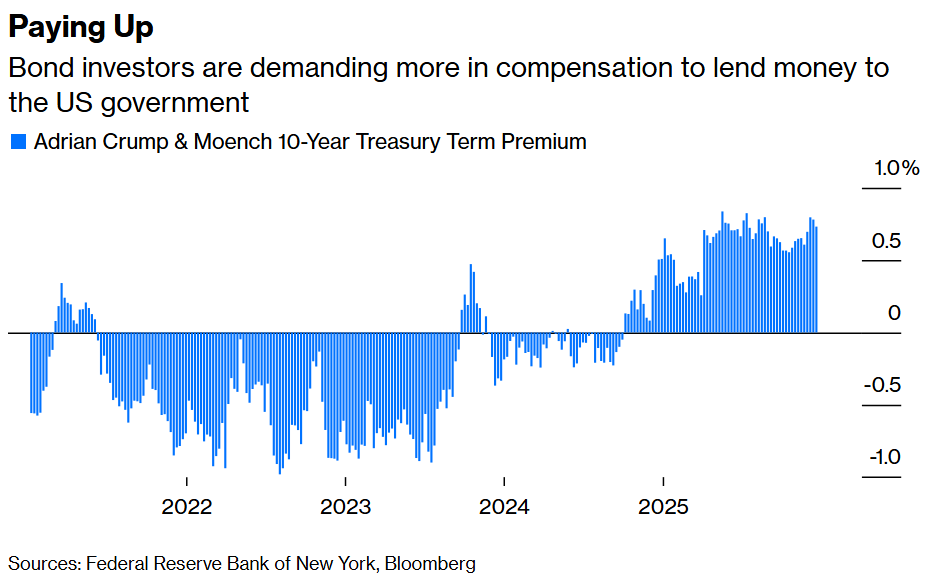 A look under the hood reveals some disturbing trends. For one, there’s ample evidence that borrowers are demanding more than is typical to lend longer term to the US government. One such measure is the term premium on the 10-year Treasury note, which is essentially the extra compensation investors demand to own long-term bonds rather than buying and continually rolling over short-maturity securities such as Treasury bills. It surged to 0.91 percentage point in the weeks after Trump’s disastrous “Liberation Day” tariff announcement in April, the most since 2014, and has remained elevated.