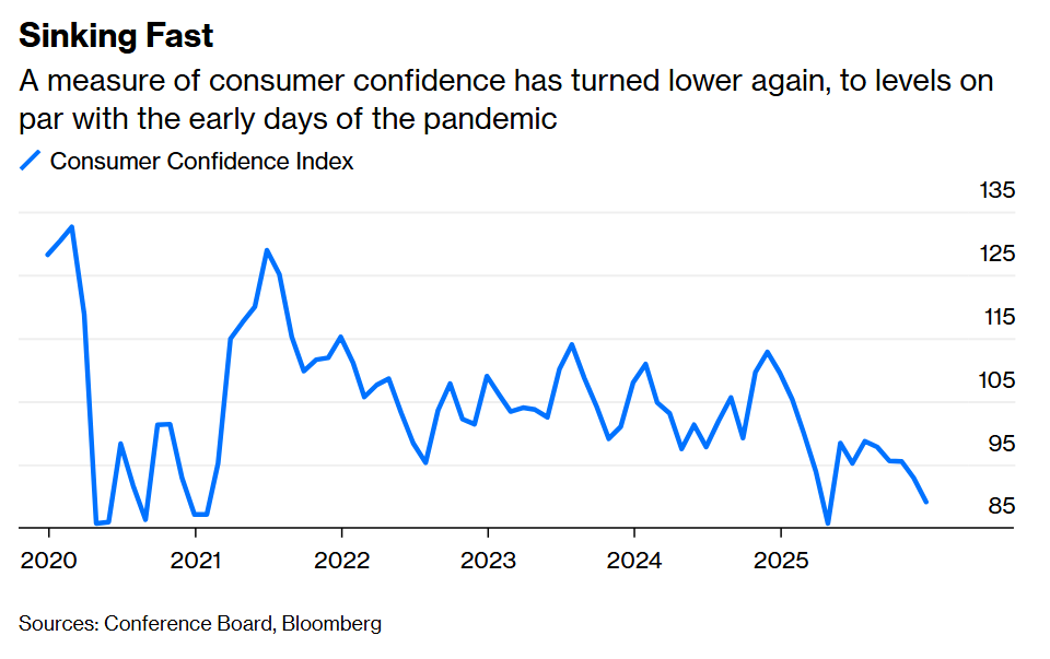 No wonder households are worried. The Conference Board’s measure of consumer confidence has dropped to levels on par with the first few months when Covid-19 was ravaging the world. “Consumers’ write-in responses pertaining to factors affecting the economy continued to be led by references to prices and inflation, tariffs and trade, and politics, with increased mentions of the federal government shutdown,” Dana Peterson, chief economist at the Conference Board, said in a statement accompanying the November results.