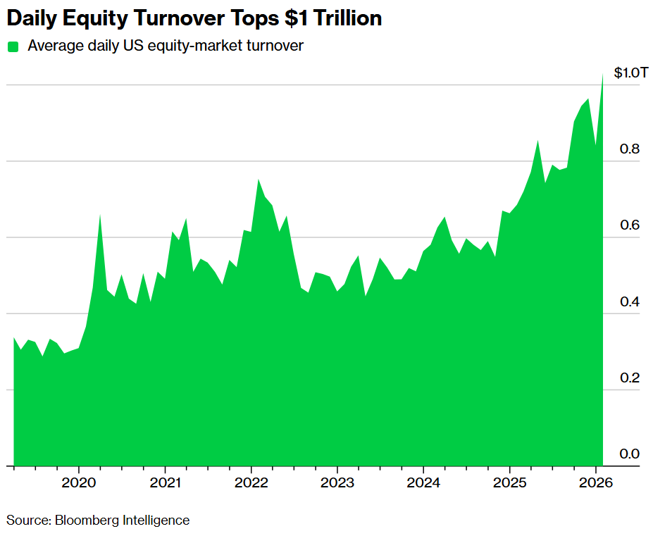 Equity turnover averaged a record $1.03 trillion in January, a roughly 50% increase from the same period in 2025, according to data compiled by Bloomberg Intelligence. More than 19 billion shares traded hands daily over the span, the second-most ever.